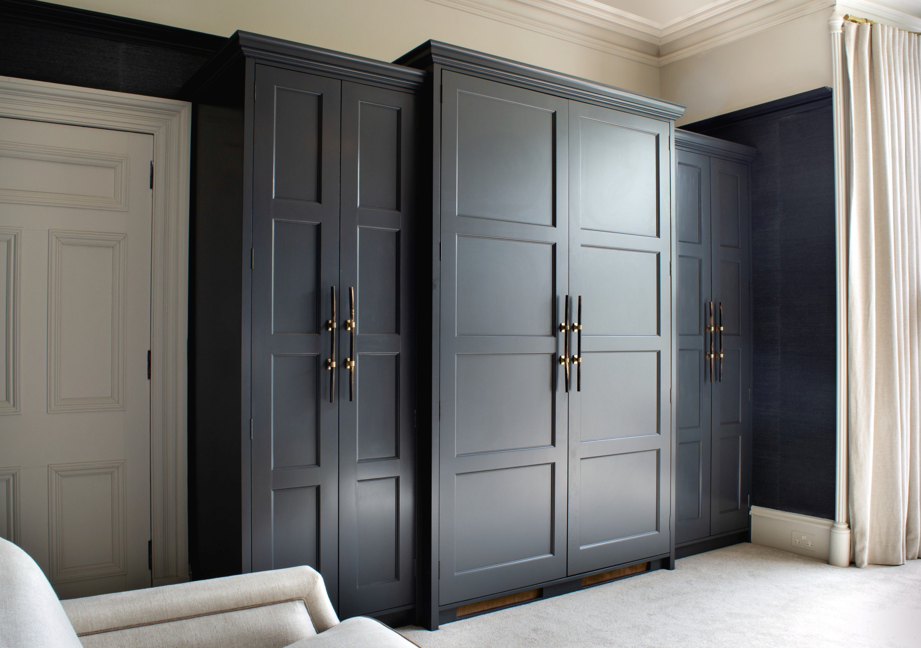 The handles are made with natural horn and solid bronze and the doors are hand-painted in a deep charcoal and the eight dovetailed interior drawers are made with rich-grained Aberdeenshire Elm.