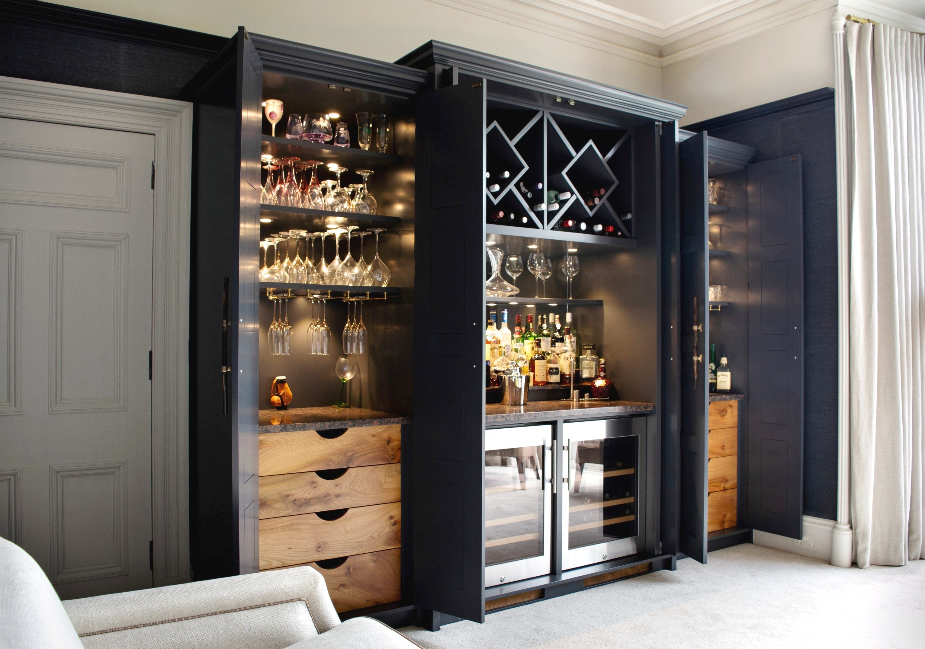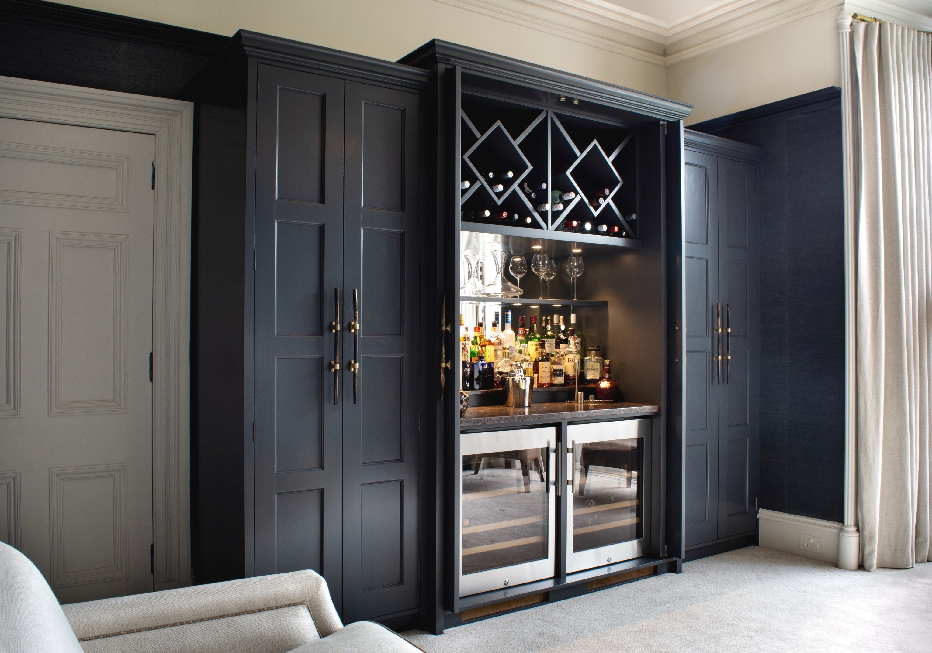 A classic styled and restrained exterior meets a bold and glamorous interior with this drinks cabinet project for a client in Aberdeen.