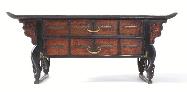 The upturned ends of the top and the splayed feet are reminiscent of antique Korean furniture or even the shape of a Torri gate at the entrance to a Japanese temple.