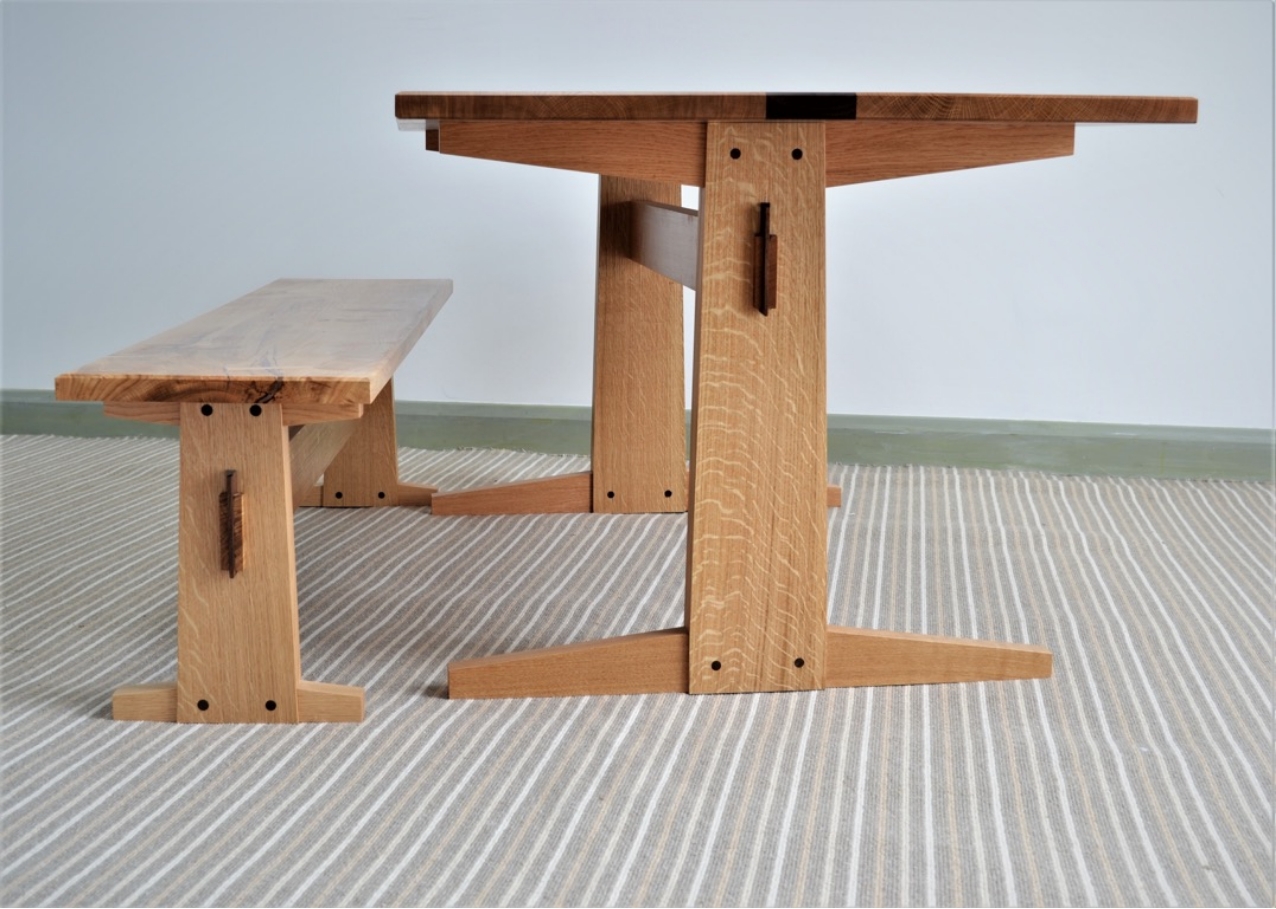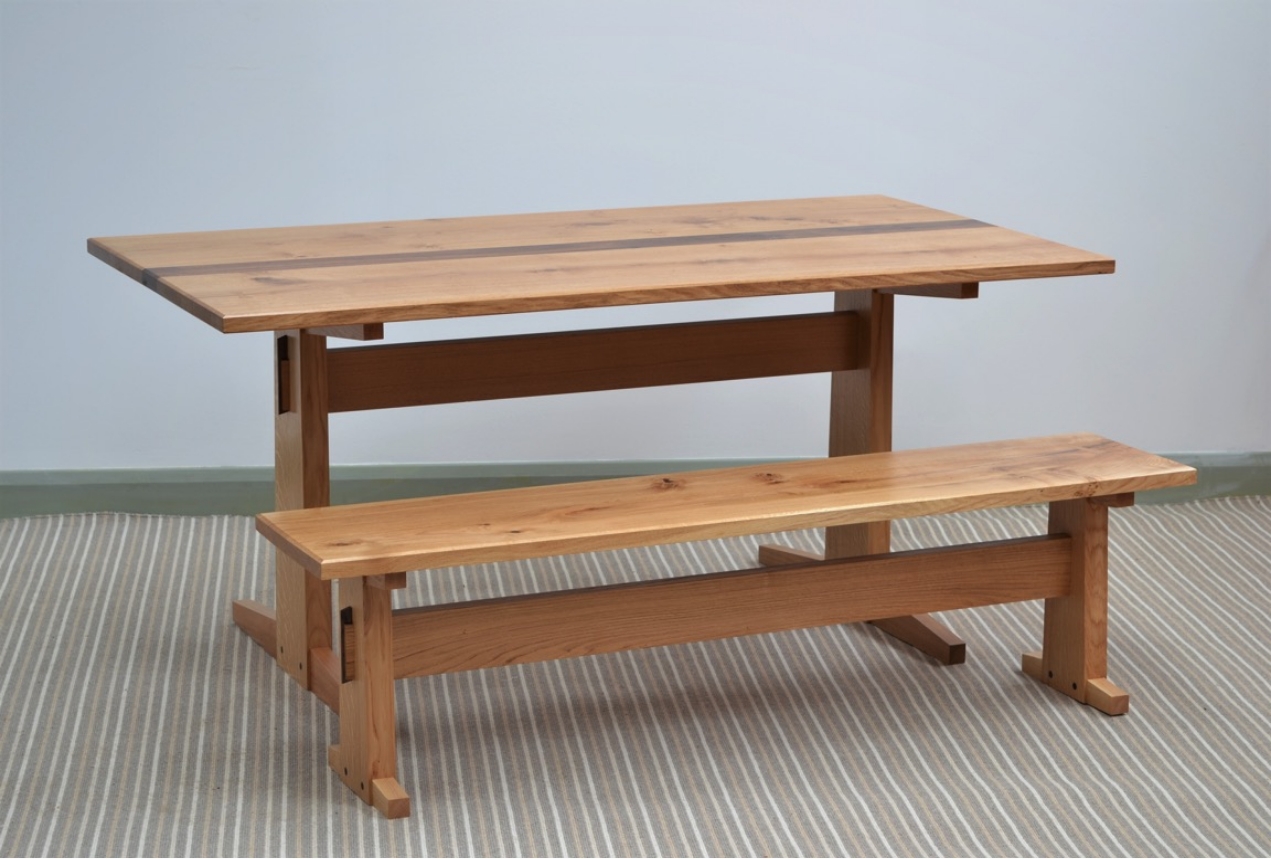 The table and bench were skillfully made by one of our cabinetmakers. Hand rubbed oil finish by Steve Gordon. Design by George Nakashima.boards of character Oak and commissioned us to build a Japanese style table using these two boards with a contrasting middle board of dark Walnut.